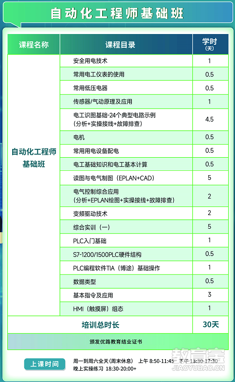 自动化工程师基础班主要学习内容:常用低压电器(原理/识图/接线);识读PLC程序;故障排查;简单控制柜配盘;综合实训(一)。